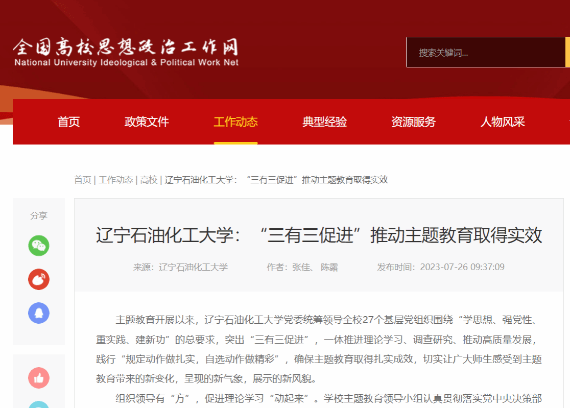 编者按:近日,全国高校思想政治工作网、辽宁日报·北国号对我校党委统筹领导全校27个基层党组织围绕“学思想、强党性、重实践、建新功”的总要求,突出“三有三促进”,一体推进理论学习、调查研究、推动高质量发展,践行“规定动作做扎实,自选动作做精彩”,确保主题教育取得扎实成效,切实让广大师生感受到主题教育带来的新变化,呈现的新气象,展示的新风貌作了报道,文章由张佳、 陈露撰写。现将相关报道转载如下: