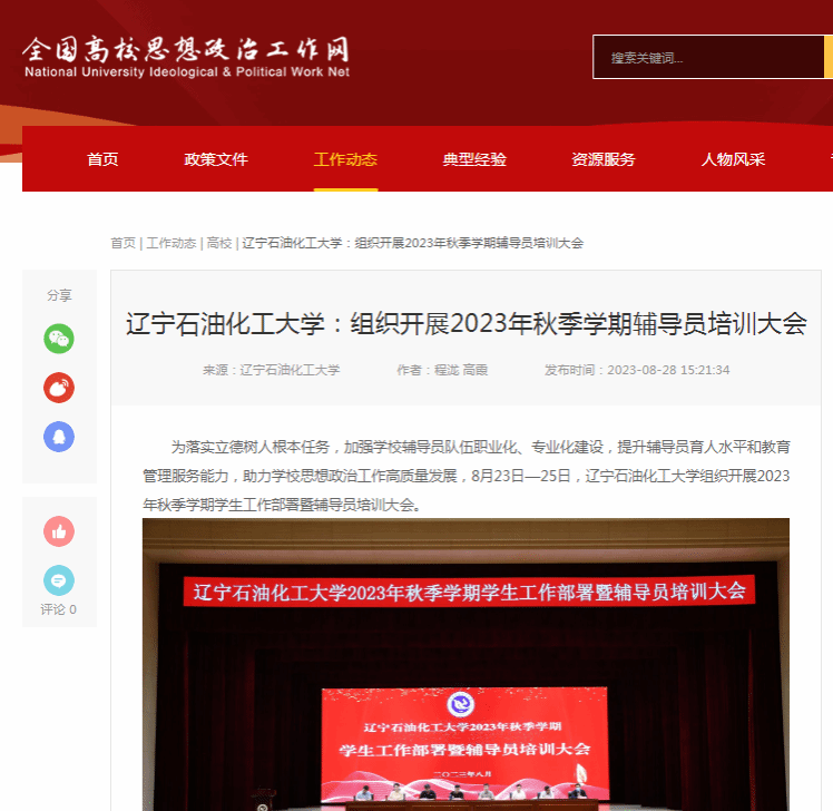 编者按:近日,全国高校思想政治工作网、辽宁高校思政、辽宁日报·北国号、人民日报客户端·人民号等媒体平台对我校组织开展2023年秋季学期学生工作部署暨辅导员培训大会进行了宣传报道。现将相关报道转载如下: