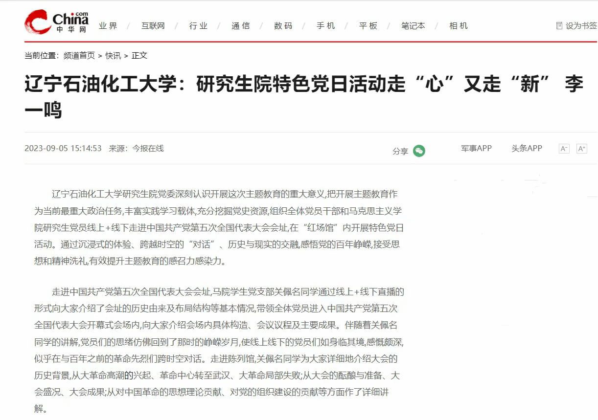 编者按:近日,中华网对我校研究生院党委组织全体党员干部和马克思主义学院研究生党员线上+线下走进中国共产党第五次全国代表大会会址,在“红场馆”内开展特色党日活动进行了宣传报道。现将相关报道转载如下: