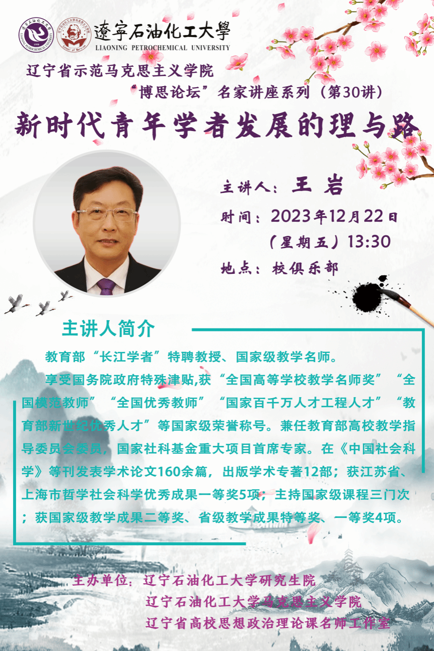 本次讲座邀请教育部长江学者、国家级教学名师王岩教授担任主讲人,讲座题目是《新时代青年学者发展的理与路》。具体时间和详细内容,请参阅宣传海报。